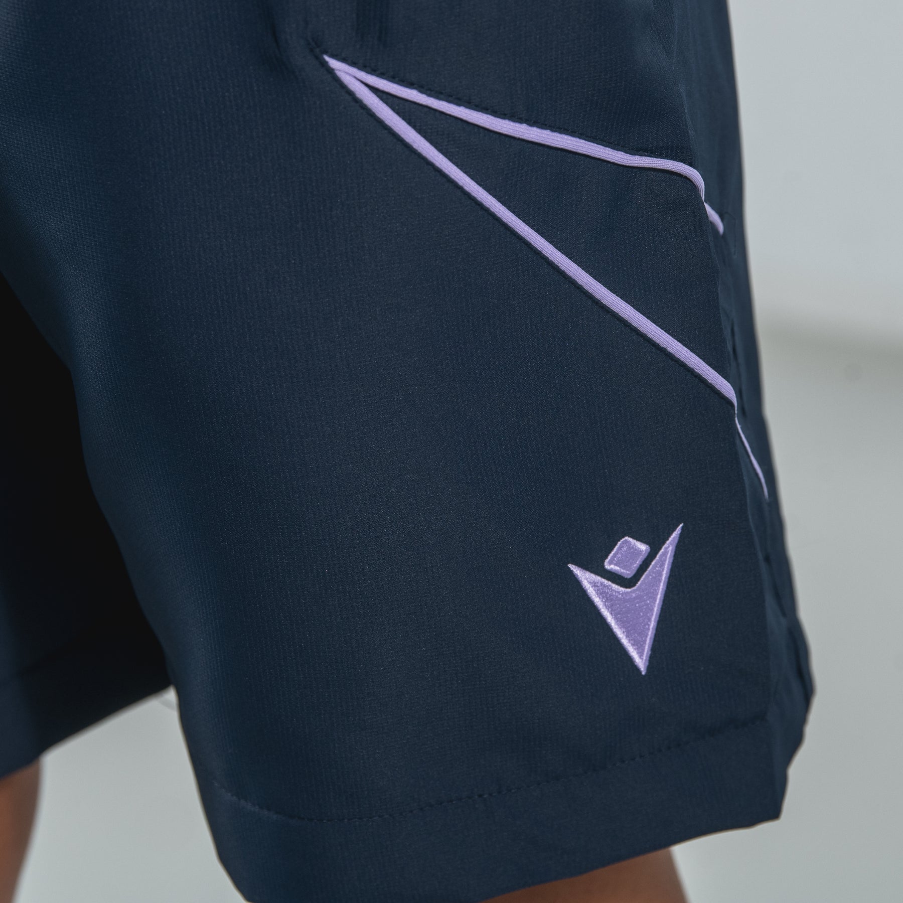 The Levante UD travel shorts for the 25/26 season are the shared garment for players and coaching staff: navy blue base with lilac details. Featuring an elastic waistband with inner drawcord, side pockets with lilac piping, the full-color crest on the left leg, and the Macron logo in lilac on the right. Made from 100% recycled Eco Softlock fabric, they provide comfort, breathability, and an elegant style for Granota travels and pre-match moments.