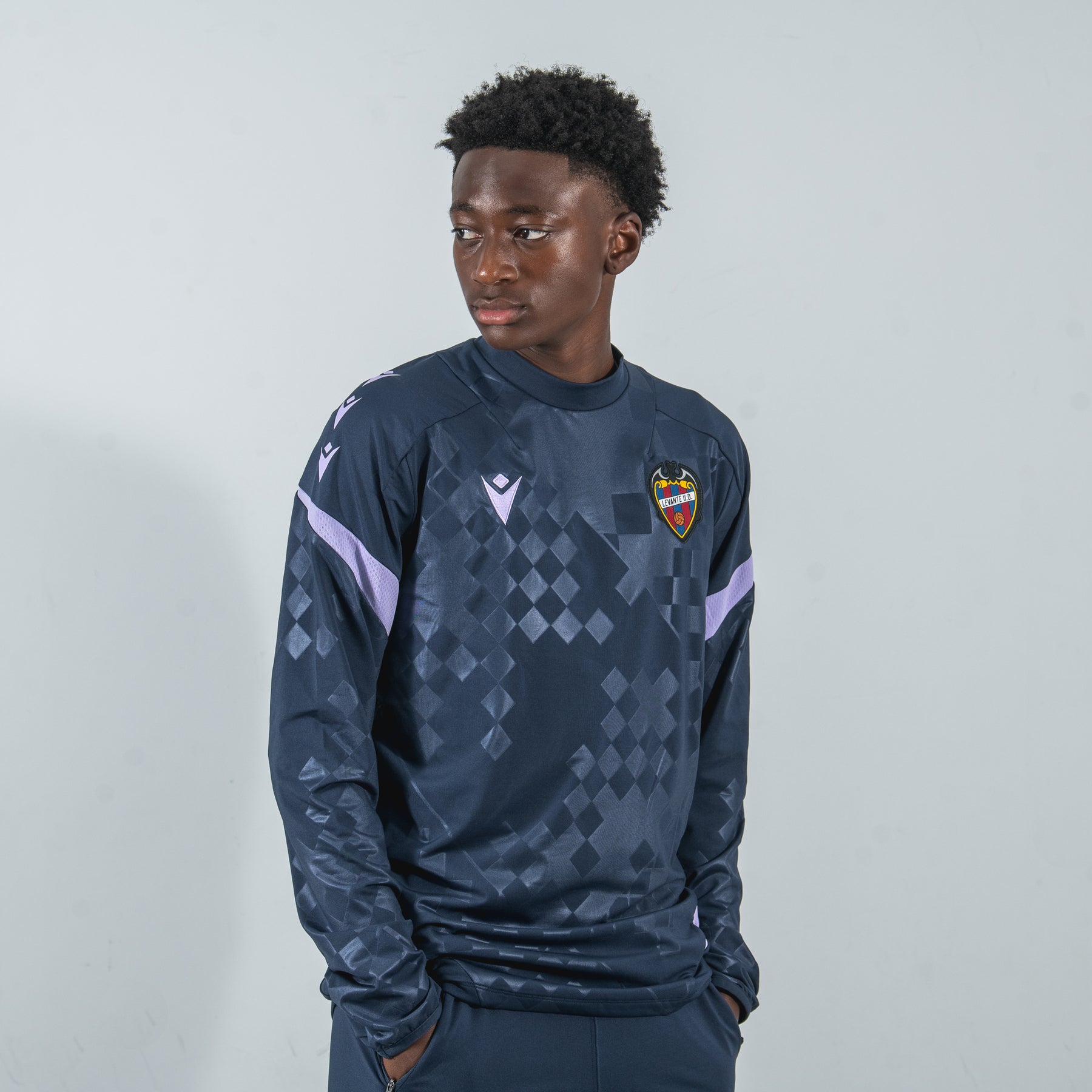The Levante UD coaching staff training sweatshirt for the 2025/26 season maintains the colors of the training shirt: a navy blue base with lilac details.