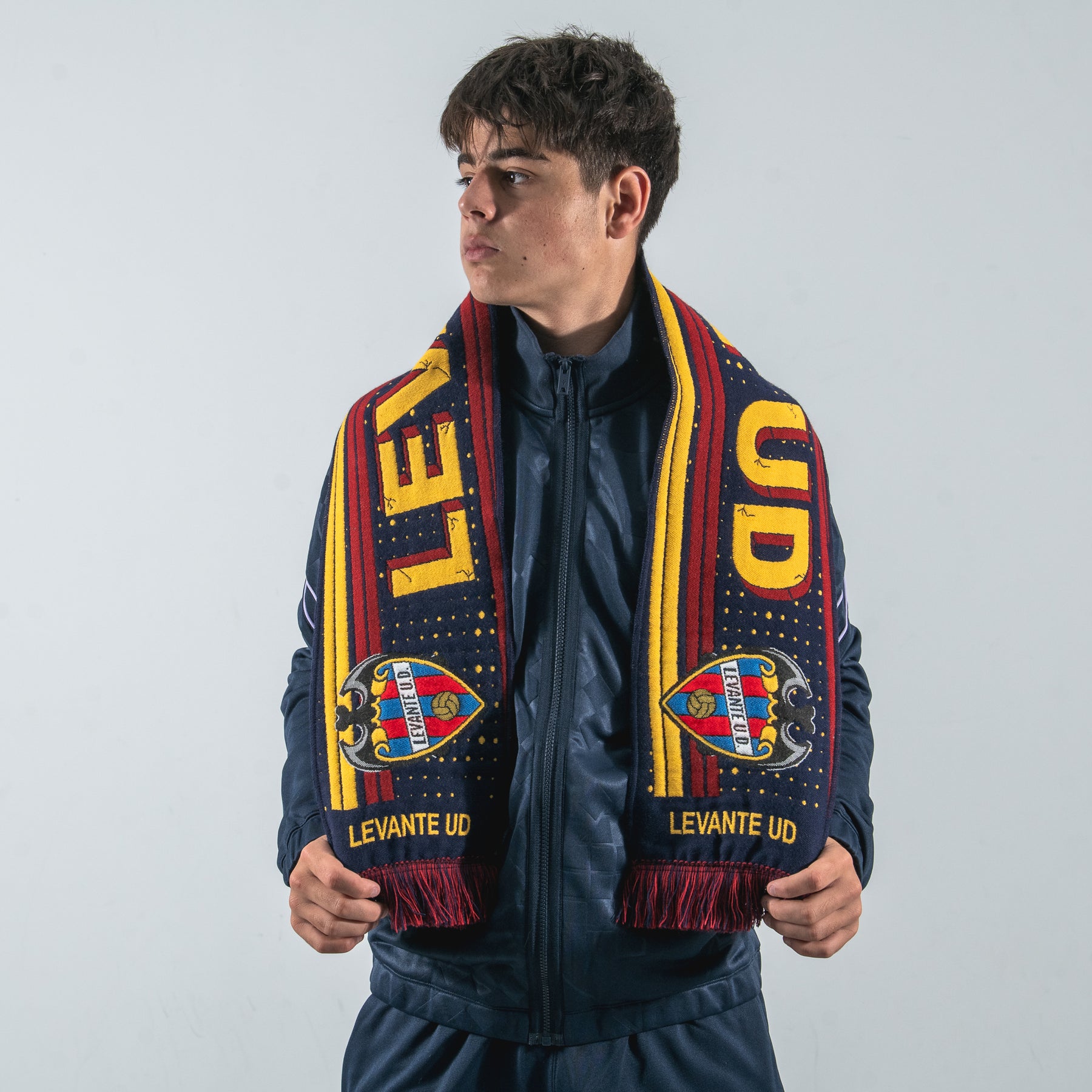 La bufanda premium "Levante UD" brilla con fondo en azul marino, con franjas granates y doradas en diagonal. Destaca el texto "LEVANTE UD" en letras doradas con efecto comic, escudos bordados en los extremos y flecos en azulgrana, ideal para aficionados que quieren lucir con elegancia y distinción en los partidos granotas.