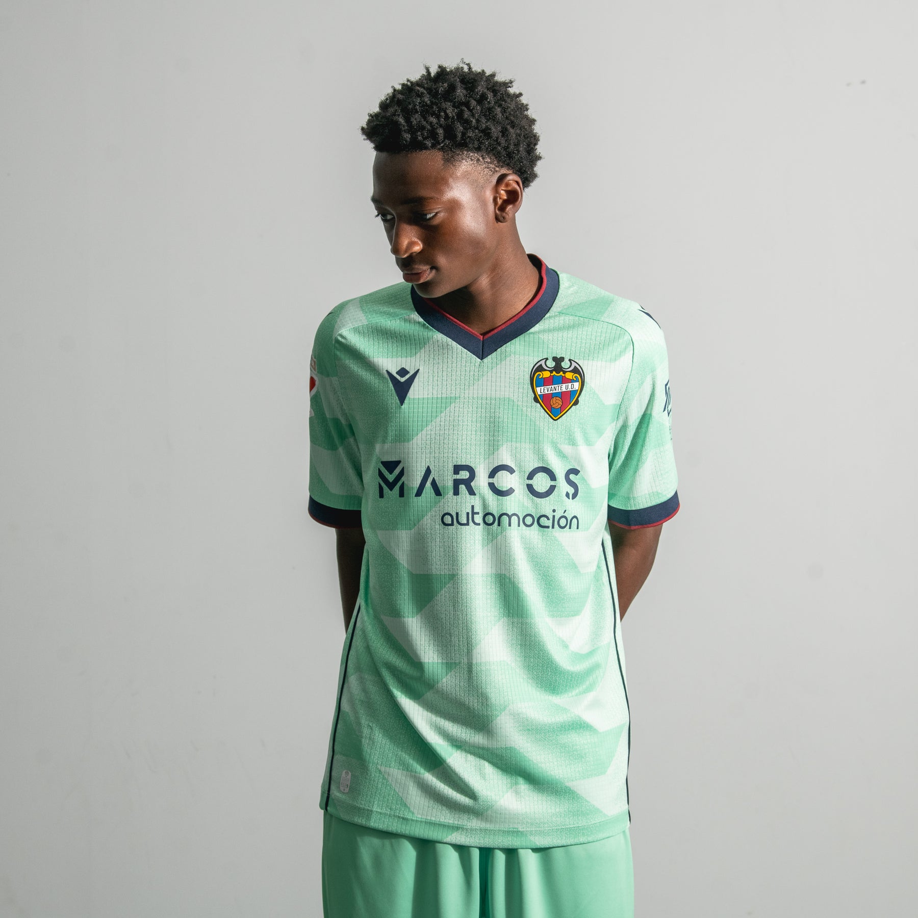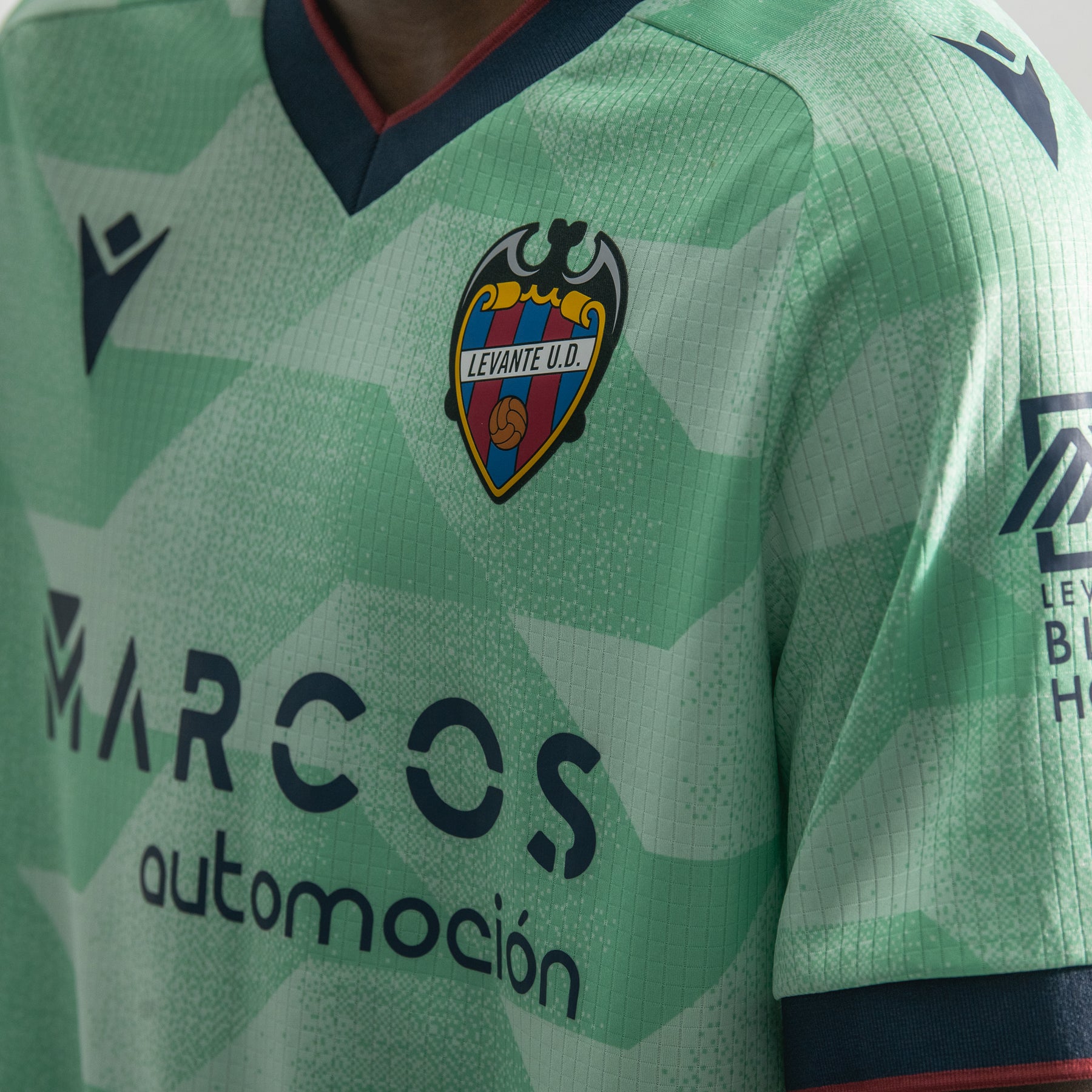 Verde menta, detalles azulgranas y un diseño gráfico geométrico y moderno: así es la tercera equipación del Levante UD para la temporada 2025-2026, diseñada por Macron.