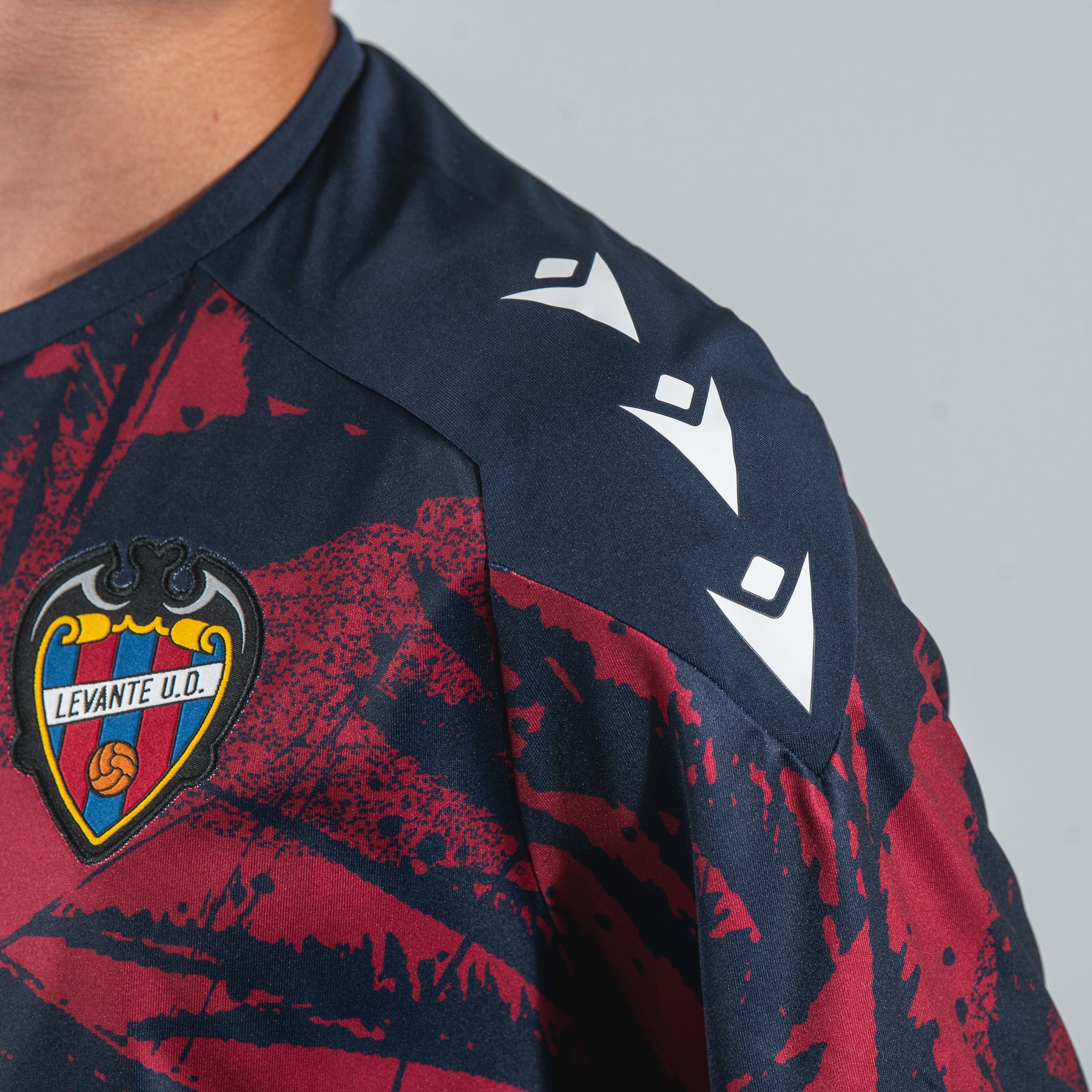 Confeccionada por Macron, socio técnico del club, la camiseta combina modernidad y memoria, empleando tejidos técnicos ligeros y transpirables, ideales para los momentos previos al partido. En el pecho destaca el escudo del Levante UD en alta definición y el logotipo de Macron en blanco. Un diseño que une historia, identidad y pasión por los colores granotas.