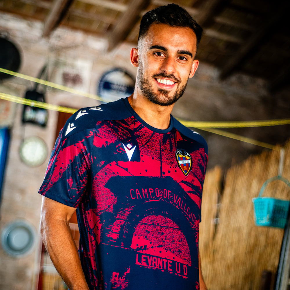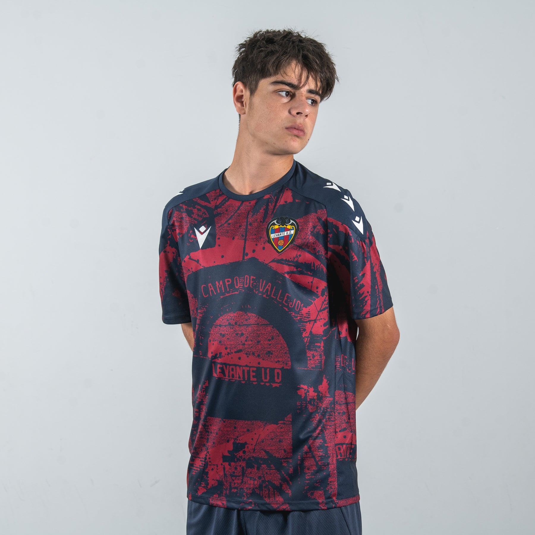 Sobre una base en azul marino y granate, el diseño incorpora en el pecho una representación artística en tonos rojizos del acceso original al estadio, incluyendo los textos "CAMPO DE VALLEJO" y "LEVANTE U.D.", tal y como lucía en la fachada de entrada. Este guiño visual conecta el presente del club con sus raíces, evocando la época en la que el Levante UD empezó a consolidarse como entidad deportiva en Valencia.