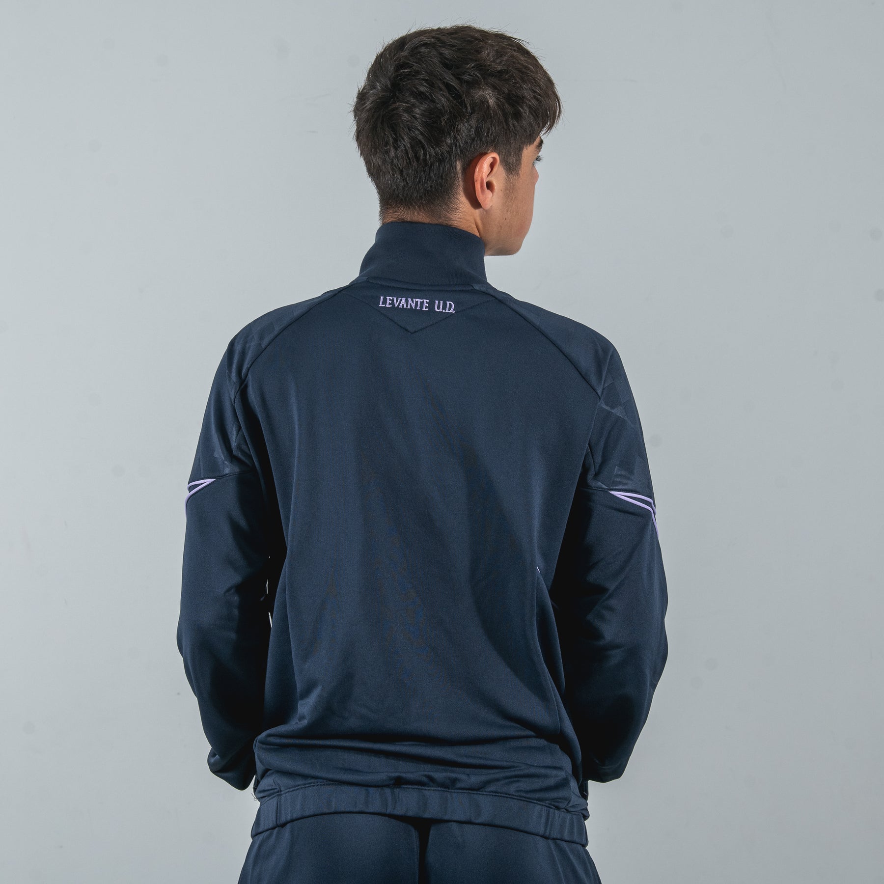 El chándal de paseo del Levante UD para la temporada 25/26 es el conjunto compartido por jugadores y cuerpo técnico: base en azul marino con detalles en lila. La chaqueta de cremallera completa presenta patrón geométrico sublimado en tono sobre tono, escudo a color en el pecho, logo de Macron en lila en el hombro izquierdo y ribetes en lila. El pantalón, con cintura elástica, incorpora el escudo en la pierna izquierda, logo de Macron en lila en la derecha y detalles curvos en lila en las perneras. Confeccionado en tejido Eco Softlock 100% reciclado, ofrece calidez, transpirabilidad y un estilo elegante para los desplazamientos granotas.