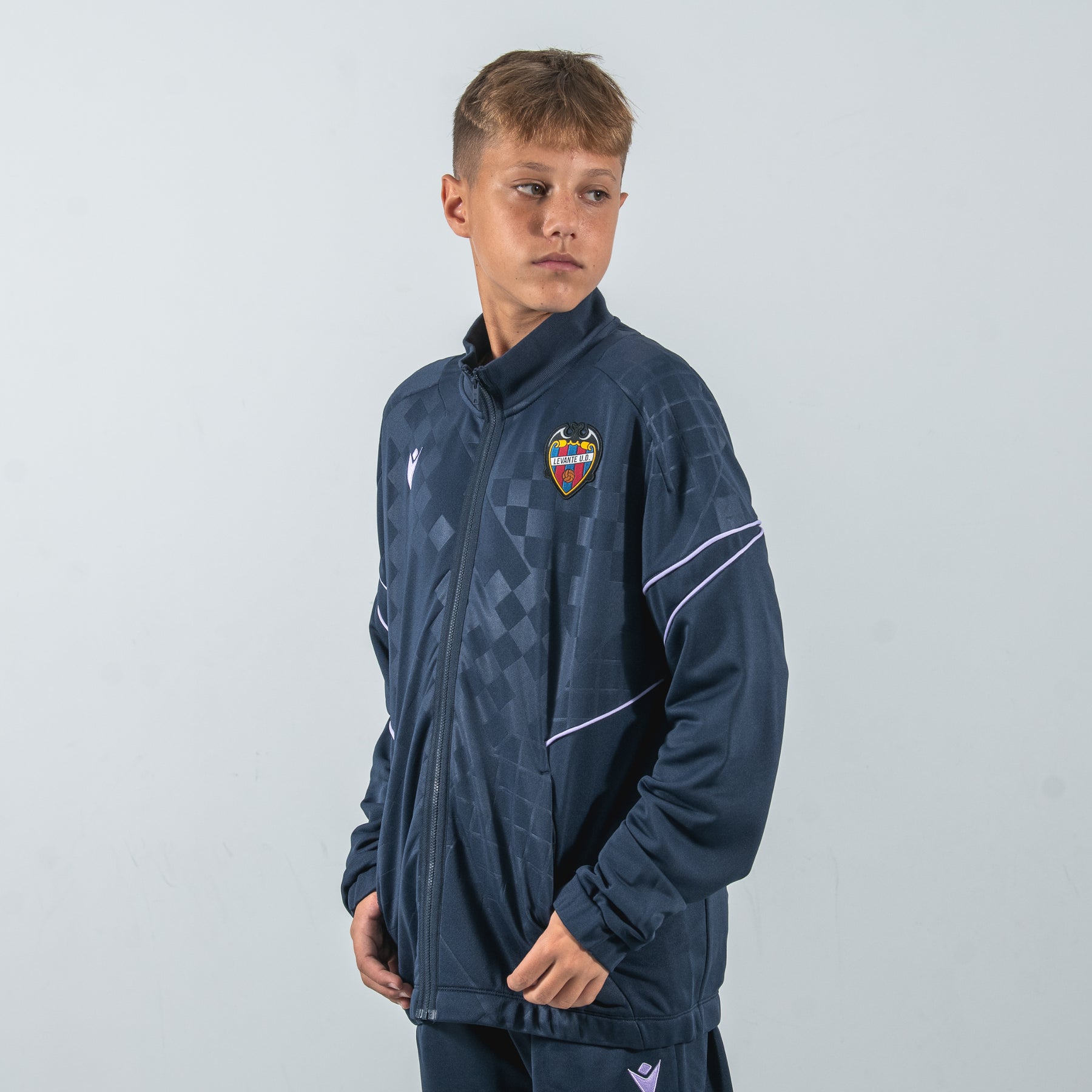 El chándal de paseo del Levante UD para la temporada 25/26 es el conjunto compartido por jugadores y cuerpo técnico: base en azul marino con detalles en lila. La chaqueta de cremallera completa presenta patrón geométrico sublimado en tono sobre tono, escudo a color en el pecho, logo de Macron en lila en el hombro izquierdo y ribetes en lila. El pantalón, con cintura elástica, incorpora el escudo en la pierna izquierda, logo de Macron en lila en la derecha y detalles curvos en lila en las perneras. Confeccionado en tejido Eco Softlock 100% reciclado, ofrece calidez, transpirabilidad y un estilo elegante para los desplazamientos granotas.