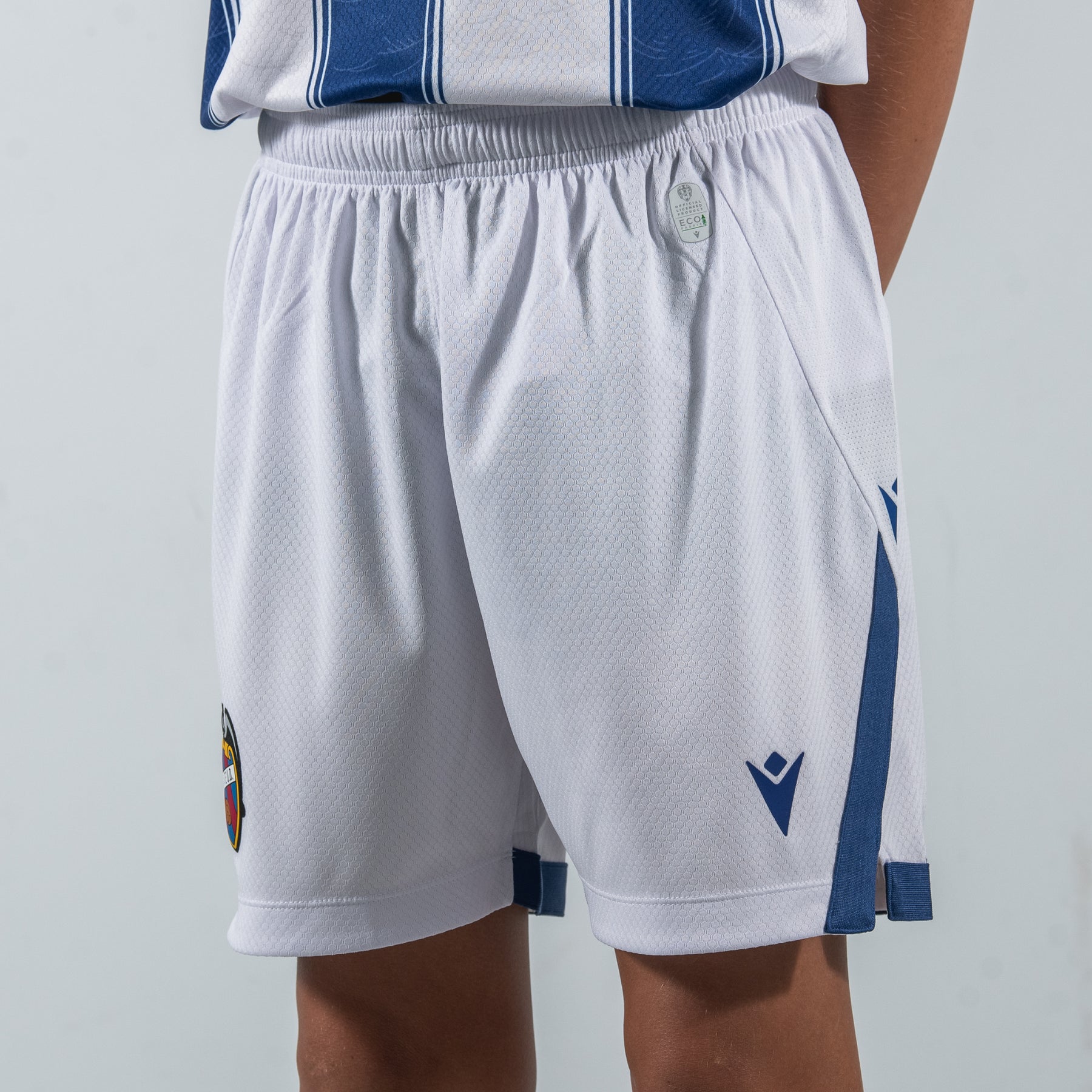 Los pantalones de la segunda equipación completan el uniforme visitante con un diseño limpio y sofisticado en blanco, inspirado en la pureza y el movimiento del mar. Destacan los detalles laterales en azul marino que fluyen hacia la parte inferior, el escudo del club bordado en la pierna derecha y el Macron Hero, en azul marino, en la izquierda. Confeccionados en Eco Exalock 100% reciclado, incorporan textura microperforada para una óptima transpirabilidad, cintura elástica con cordón interno y un corte ergonómico que garantiza libertad de movimiento y sostenibilidad.