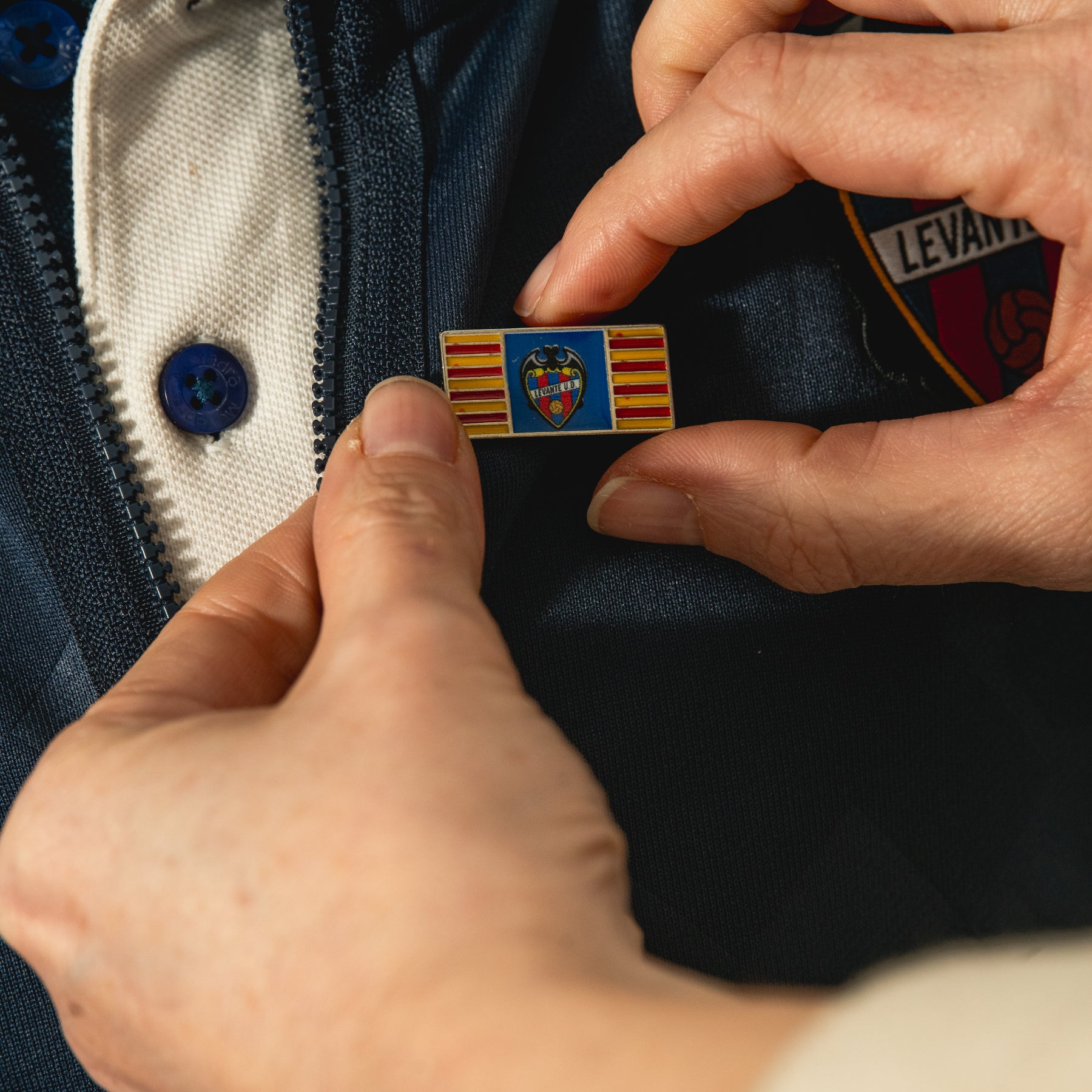 Luce la distinción del capitán en tu solapa con este pin metálico que miniaturiza el brazalete oficial del Levante UD con un nivel de detalle excepcional; su acabado esmaltado y brillante resalta las franjas de la Senyera y el escudo, convirtiéndolo en un complemento elegante y simbólico ideal para los aficionados que quieren llevar sus colores con orgullo y sutileza en cualquier prenda.